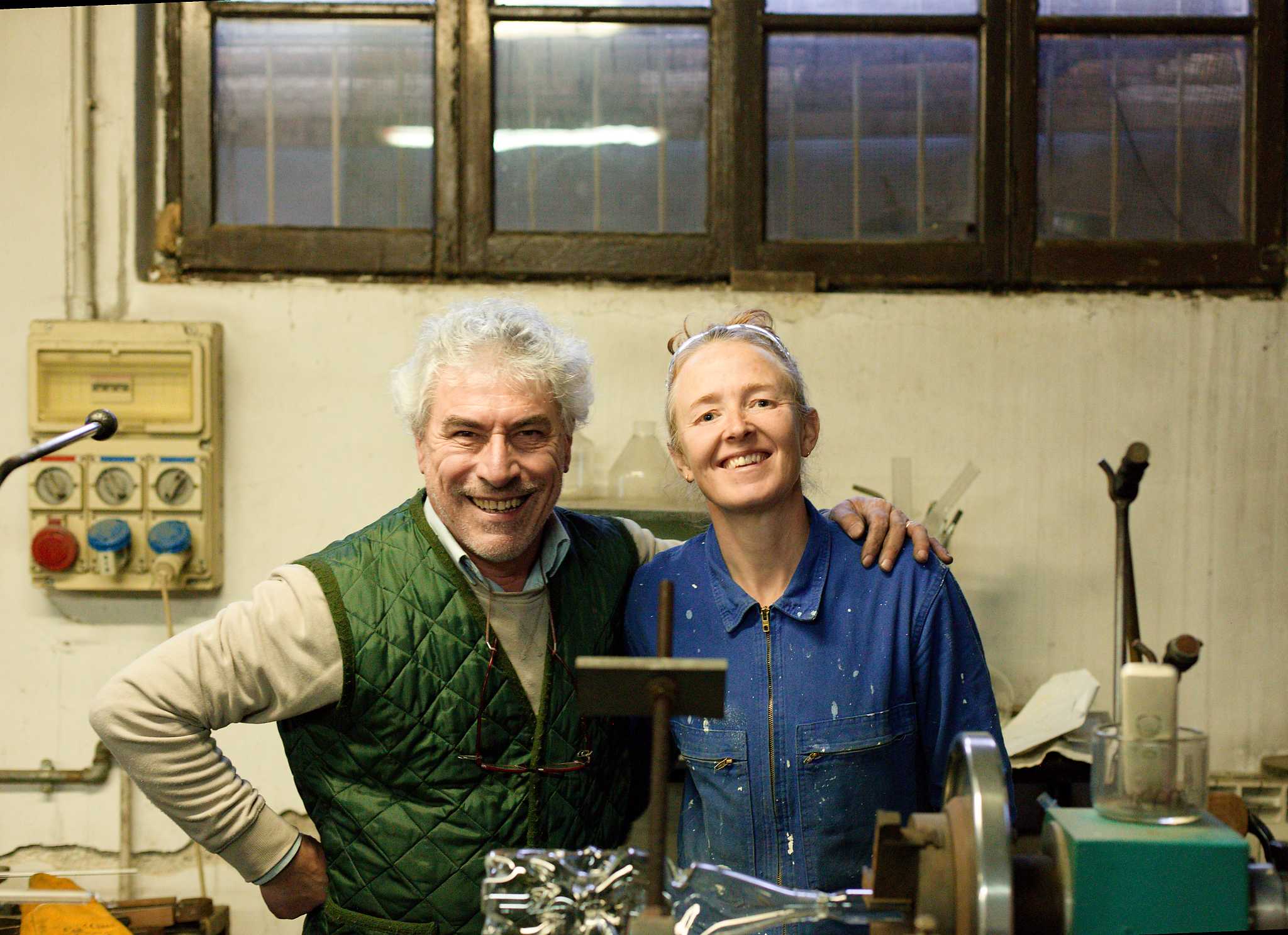 In early March, gethan&myles returned to Milan to build the “impossible” sculpture-machine – an irreverent engine created entirely from objects found along the Lambro River, brought to life through an intense week of work. This week also included a collaboration with master glassmaker Carlo Cereda, who contributed to crafting the unique glass bottles designed by the artists.